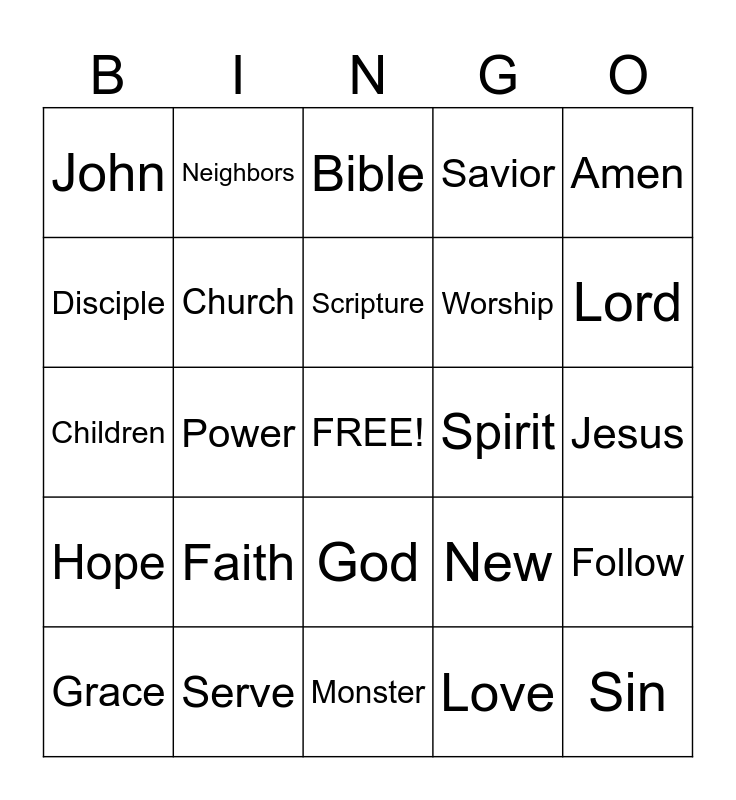 This bingo card has a free space and 31 words: Monster, Cross, Power, Death, John, Bible, Church, New, Spirit, Love, Jesus, Sin, Father, Pray, Lord, Song, Follow, Faith, Hope, God, Amen, Gospel, Grace, Neighbors, Worship, Disciple, Savior, Children, Serve, Scripture and Life.