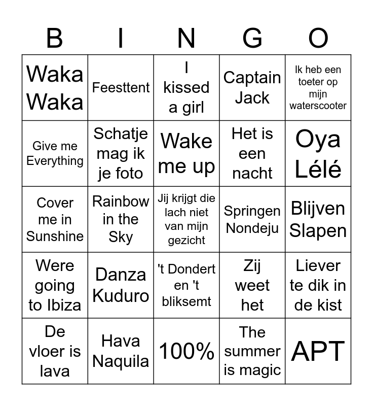 This bingo card has 65 words: Friday, Macarena, Party Rock Anthem, Liever te dik in de kist, Sunny Days, Helikopter, Feesttent, Wellerman, Wake me up, Links Rechts, 't Dondert en 't bliksemt, Let it Be, Blijven Slapen, Ik heb een toeter op mijn waterscooter, Summer, Give me Everything, Rainbow in the Sky, Waka Waka, De hele tent gaat als een Jojo, Het is een nacht, Danza Kuduro, Were going to Ibiza, Captain Jack, Maak me gek, In neem je mee, Gas op die lollie, Summer Jam, Vamos a la playa, Jij krijgt die lach niet van mijn gezicht, Shirt uit en zwaaien, De vloer is lava, Leef, Lambada, I gotta feeling, Zij weet het, Hava Naquila, Ruitenwisser, Cover me in Sunshine, The summer is magic, Mambo no 5, Schatje mag ik je foto, Boten Anna, Springen Nondeju, Het vliegerlied, Sexy als ik dans, Ik ben kachel, Oya Lélé, Que si, que no, APT, Europapa, Like a prayer, Baby one more time, C'est la vie, 100%, Ken je dat gevoel, Casual, Iconisch, I kissed a girl, Firework, Shake it off, Cruel summer, Smells like teen spirit, Californacation, One last time and Dynamite.