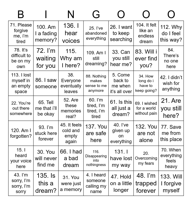 This bingo card has 141 words: Free!, 1. I wrote a letter for you, 2. Wake me up from this dream, 3. I have to stop, I have to stop, I have to stop, 4. I heard someone calling my name, 5. Come back to me when it’s all over, 6. Will my voice ever reach you?, 7. You gave me a reason to keep going, 8. I can’t save our memories, 9. There is still time, 10. I remember how it all felt, 11. Our place is in the stars, 12. I’ll see you in another lifetime, 13. I want my childhood back, 14. I never wanted to do this, 15. I heard your voice here, 16. My thoughts do not allow me to become free, 17. I have to let go, 18. Why didn’t you save me?, 19. The voices are too loud, 20. Overcoming my fears, 21. Are you still here?, 22. You’re out there somewhere, 23. I’m drowning forever, 24. I wanted to see you one last time, 25. I’ve abandoned everything, 26. I want to keep searching, 27. Don’t look for me, 28. You still have a part of me, 29. It’s okay if you forget me, 30. You will never find me, 31. You were just a memory, 32. You promised to stay, 33. Can you still hear me?, 34. How long do i have to keep going?, 35. They are all gone, 36. Can i still go back?, 37. Finding my home, 38. Everyone eventually leaves, 39. How can I face myself?, 40. I’ve given up on everything, 41. I saw you in the mirror, 42. I didn’t wish for anything, 43. I’m sorry, I’m sorry, I’m sorry, 44. I don’t have much time left, 45. It feels cold and empty again, 46. There’s someone behind me, 47. Hold on a little longer, 48. I’m trapped forever, 49. I’ve left our old place, 50. Stay with me, 51. I hear strange voices, 52. Are these memories real?, 53. I want to go far away, 54. I wanted to save you, 55. Where do i belong?, 56. You were my safe place, 57. Is there any time left?, 58. I wanted to live, 59. I’m screaming but there’s no sound, 60. I’m tired, I’m tired, i’m tired, 61. Is this all just a dream?, 62. Where do i go from here?, 63. I woke up in a cold and dark world, 64. Sleep well, my dearest, 65. Tell me that i’ll be okay, 66. I had a bad dream, 67. I’ve tried everything and it’s not enough, 68. You are my home, 69. I wished for a world without pain, 70. When everything feels heavy, 71. Please forgive me, i’m tired, 72. I’m waiting for you, 73. When will these nightmares end?, 74. Where do i run?, 75. When will it all end?, 76. Stay safe for a moment, 77. Save me from this place, 78. It’s difficult to be on my own, 79. Will you promise me something?, 80. I wish you were here with me, 81. I’m tired of everything, 82. How do i escape these memories?, 83. Will i ever find you?, 84. There’s no one here, 85. I want to tell you something, 86. I saw someone, 87. Everything will be okay, 88. Nothing makes sense to me anymore, 89. Can i still be saved?, 90. I’m tired and it’s okay, 91. In a world of nothingness, 92. I’ve looked everywhere for you, 93. I’m stuck here forever, 94. Where are you?, 95. I feel trapped in this place, 96. Why do i feel lost?, 97. A place of eternal peace, 98. I hear voices of the past, 99. I hope it’s just a bad dream, 100. Am I a fading memory?, 101. I’ve lost everything, 102. Everywhere all at once, 103. Alone in an abandoned world, 104. It felt like an endless dream, 105. I wanted to be happy, 106. I feel nothing, 107. Where did you go?, 108. I don’t like this loneliness, 109. Am I still dreaming?, 110. An empty feeling for an empty world, 111. I had no choice, 112. Why do I feel this way?, 113. I lost myself in an empty space, 114. In a dream of nothingness, 115. Why am I here?, 116. Disappearing into nothingness, 117. Will I be remembered?, 118. In my restless dreams, I see that town, 119. Searching for something, 120. Am I forgotten?, 121. Finding peace in this loneliness, 122. Nothing feels real anymore, 123. I just want to disappear, 124. I can’t escape these memories, 125. Where am I headed?, 126. I remember this place, 127. Staring into the abyss, 128. I saw something, 129. Finding my way, 130. Am I lost?, 131. I have lost my way, 132. You are not alone, 133. Will I forgive myself, 134. Where am I?, 135. Is this a dream?, 136. I hear voices, 137. You are safe here, 138, 139 and 140.