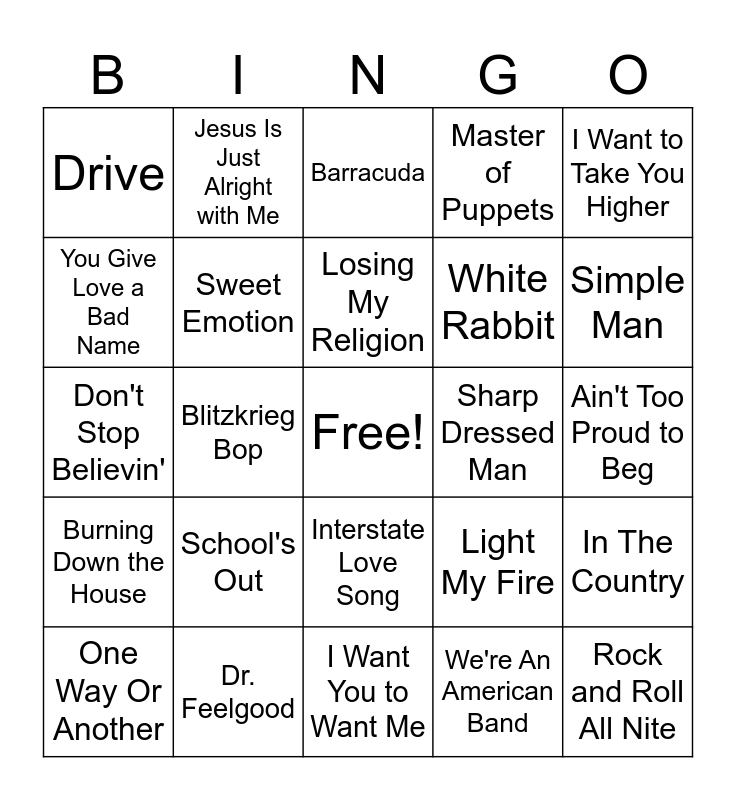 This bingo card has a free space and 36 words: American Girl, Jump, Bad Moon Rising, Sweet Emotion, Light My Fire, Burning Down the House, Losing My Religion, Take It Easy, I Want to Take You Higher, Smells Like Teen Spirit, Blitzkrieg Bop, Master of Puppets, Paradise City, Sharp Dressed Man, Simple Man, Drive, Black Hole Sun, School's Out, Rock and Roll All Nite, Barracuda, Ain't Too Proud to Beg, In The Country, Dr. Feelgood, One Way Or Another, I Want You to Want Me, Jesus Is Just Alright with Me, Don't Stop Believin', Don't Look Back, White Rabbit, You Give Love a Bad Name, Can't Stop, My Hero, We're An American Band, Interstate Love Song, Whole Lotta Love and Gimme Three Steps.
