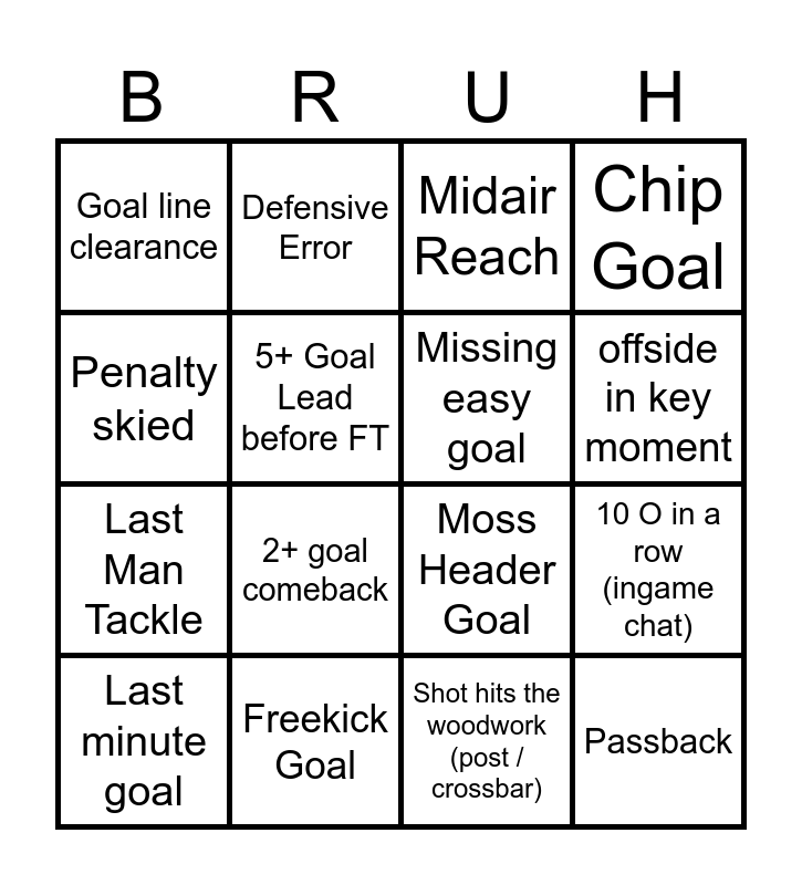 This bingo card has 28 words: Goalkeeper Error, Long Distance Goal, Last Man Tackle, Penalty Save, 5+ Goal Lead before FT, Midair Reach, Defensive Error, Passback, Freekick Goal, Toxicity Punishment, Moss Header Goal, Chip Goal, Broken Ankles (dribbling past 3+ players), Forefit, 2+ goal comeback, crucial defender lockdown, Teamsteal, Missing easy goal, offside in key moment, commentator error (wrong team, player etc), Goal line clearance, Free space, Last minute goal, 10 O in a row (ingame chat), Shot hits the woodwork (post / crossbar), match ko delayed by 10+ minutes, Penalty skied and Through pass to unmarked player.