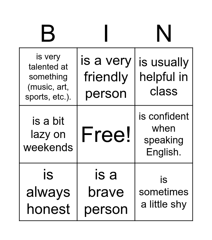 This bingo card has a free space and 11 words: is usually kind to others, is a brave person, is sometimes a little shy, is always honest, is a very friendly person, is usually helpful in class, is confident when speaking English., is usually energetic and full of energy, is a bit lazy on weekends, is very talented at something (music, art, sports, etc.). and is charming and makes people smile easily.