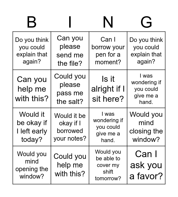 This bingo card has 16 words: Could you help me with this?, Would you mind closing the window?, Can I borrow your pen for a moment?, Do you think you could explain that again?, Would it be okay if I left early today?, Can you please send me the file?, I was wondering if you could give me a hand., Would you be able to cover my shift tomorrow?, Can you help me with this?, Could you please pass me the salt?, Would you mind opening the window?, Do you think you could explain that again?, Would it be okay if I borrowed your notes?, I was wondering if you could give me a hand., Is it alright if I sit here? and Can I ask you a favor?.