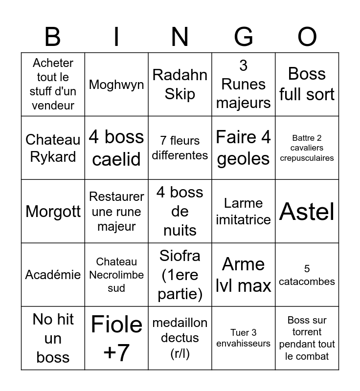 This bingo card has a free space and 24 words: Chateau Necrolimbe sud, Fiole +7, 7 fleurs differentes, No hit un boss, Boss full sort, Acheter tout le stuff d'un vendeur, Chateau Rykard, Moghwyn, Larme imitatrice, Siofra (1ere partie), Faire 4 geoles, Morgott, Arme lvl max, 5 catacombes, 4 boss caelid, Tuer 3 envahisseurs, Astel, Radahn Skip, Battre 2 cavaliers crepusculaires, Restaurer une rune majeur, Boss sur torrent pendant tout le combat, Académie, 3 Runes majeurs and medaillon dectus (r/l).