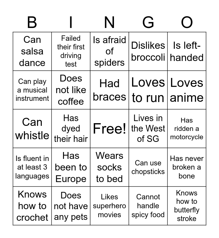 This bingo card has a free space and 24 words: Has been to Europe, Does not have any pets, Had braces, Knows how to crochet, Is left-handed, Can salsa dance, Can play a musical instrument, Failed their first driving test, Lives in the West of SG, Wears socks to bed, Loves to run, Can whistle, Can use chopsticks, Has never broken a bone, Does not like coffee, Cannot handle spicy food, Has ridden a motorcycle, Is afraid of spiders, Loves anime, Has dyed their hair, Knows how to butterfly stroke, Is fluent in at least 3 languages, Dislikes broccoli and Likes superhero movies.