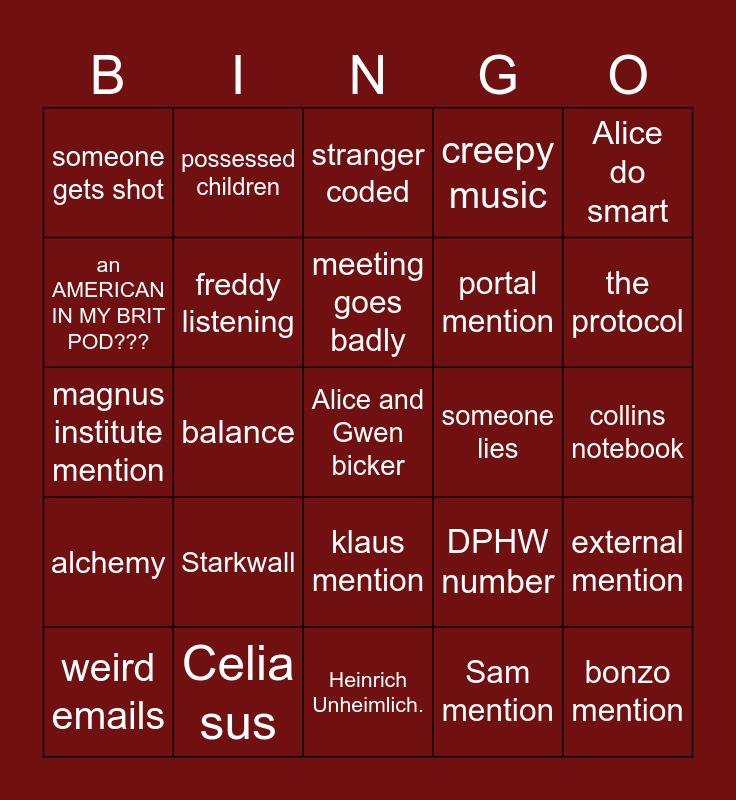 This bingo card has a free space and 24 words: Starkwall, Celia sus, meeting goes badly, weird emails, Alice do smart, someone gets shot, an AMERICAN IN MY BRIT POD???, possessed children, someone lies, klaus mention, portal mention, magnus institute mention, DPHW number, external mention, freddy listening, Sam mention, collins notebook, stranger coded, the protocol, balance, bonzo mention, alchemy, creepy music and Heinrich Unheimlich..