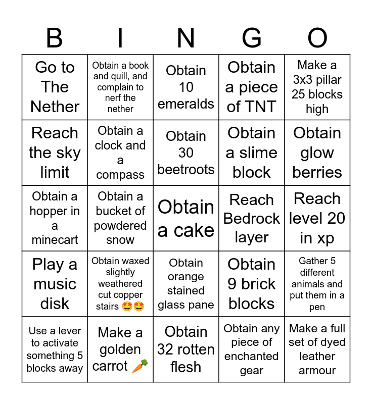 This bingo card has 25 words: Obtain waxed slightly weathered cut copper stairs 🤩🤩, Obtain 32 rotten flesh, Obtain 30 beetroots, Use a lever to activate something 5 blocks away, Make a 3x3 pillar 25 blocks high, Go to The Nether, Reach the sky limit, Obtain a book and quill, and complain to nerf the nether, Reach Bedrock layer, Obtain orange stained glass pane, Obtain a slime block, Obtain a hopper in a minecart, Obtain 9 brick blocks, Gather 5 different animals and put them in a pen, Obtain a clock and a compass, Make a full set of dyed leather armour, Reach level 20 in xp, Obtain 10 emeralds, Obtain glow berries, Obtain a bucket of powdered snow, Obtain a cake, Make a golden carrot 🥕, Play a music disk, Obtain a piece of TNT and Obtain any piece of enchanted gear.