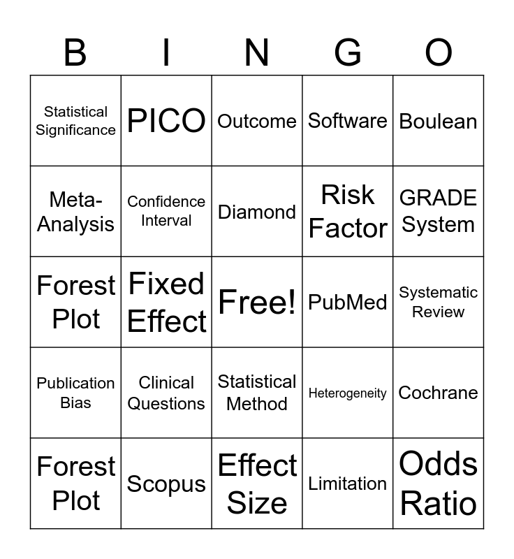 This bingo card has a free space and 24 words: Clinical Questions, Scopus, Diamond, Forest Plot, Boulean, Statistical Significance, Meta-Analysis, PICO, PubMed, Statistical Method, Risk Factor, Forest Plot, Heterogeneity, Cochrane, Confidence Interval, Limitation, Systematic Review, Outcome, GRADE System, Fixed Effect, Odds Ratio, Publication Bias, Software and Effect Size.