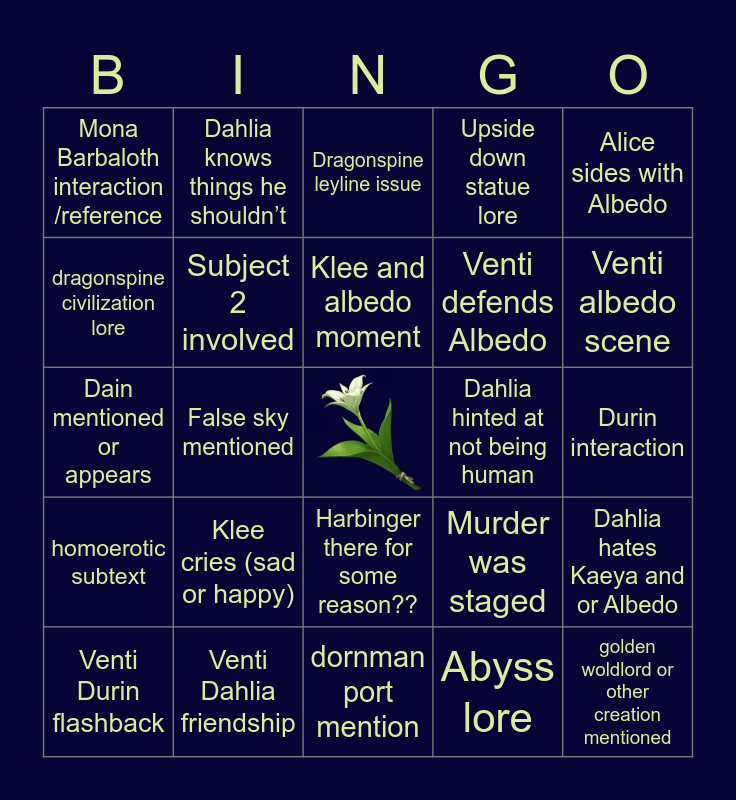 This bingo card has a free space and 43 words: Albedo actually has a moment of insanity, Klee cries (sad or happy), Alice lore, Rhinedottir lore, golden woldlord or other creation mentioned, Kaeya being suspicious, Subject 2 involved, Rosaria and Albedo cooperation, Upside down statue lore, Dahlia hates Kaeya and or Albedo, Mona Barbaloth interaction /reference, Venti Dahlia friendship, Murder was staged, Durin interaction, Venti exposed as archon, Protective venti, Dragonspine leyline issue, Dahlia hinted at not being human, Heart of naberius lore, Dain mentioned or appears, Dahlia knows things he shouldn’t, Klee and albedo moment, hexenzircle is morally ambiguous, Alice sides with Albedo, There’s a third albedo, Albedo makes Durin a body, Character from another region is there for no reason, Venti hates Rhinedottir, Venti Durin flashback, Durin is actually a bit crazy, Albedo murdered S2, Abyss lore, Jean worried about kaeya or albedo, homoerotic subtext, venti story quest part 2, dornman port mention, Kaeya already knows albedo is a homunculus, Venti albedo scene, dragonspine civilization lore, False sky mentioned, Harbinger there for some reason??, Venti defends Albedo and Moon lore.