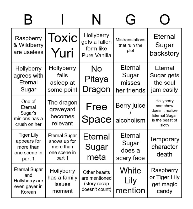 This bingo card has a free space and 24 words: Eternal Sugar shows up for more than one scene in part 1, Hollyberry has a family issues moment, No Pitaya Dragon, Eternal Sugar and Hollyberry are even gayer in Korean, Eternal Sugar backstory, Raspberry & Wildberry are useless, Hollyberry agrees with Eternal Sugar, Toxic Yuri, Berry juice / alcoholism, Eternal Sugar meta, Eternal Sugar misses her friends, One of Eternal Sugar's minions has a crush on her, Eternal Sugar does a scary face, Temporary character death, Hollyberry falls asleep at some point, White Lily mention, Hollyberry somehow doesn't realize Eternal Sugar is the beast of sloth, Hollyberry gets a fallen form like Pure Vanilla, Eternal Sugar gets the soul jam easily, The dragon graveyard becomes relevant, Raspberry or Tiger Lily get magic candy, Tiger Lily appears for more than one scene in part 1, Mistranslations that ruin the plot and Other beasts are mentioned (story recap doesn't count).