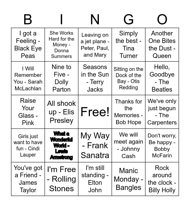 This bingo card has a free space and 24 words: What a Wonderful World - Lewis Armstrong, I'm Free - Rolling Stones, Seasons in the Sun - Terry Jacks, You've got a Friend - James Taylor, Another One Bites the Dust - Queen, I got a Feeling - Black Eye Peas, I Will Remember You - Sarah McLachlan, She Works Hard for the Money - Donna Summers, Thanks for the Memories - Bob Hope, My Way - Frank Sanatra, Sitting on the Dock of the Bay - Otis Redding, Raise Your Glass - Pink, We will meet again - Johnny Cash, Don't worry, Be happy - Bobby McFarin, Nine to Five - Dolly Parton, Manic Monday - Bangles, We've only just begun - The Carpenters, Leaving on a jet plane - Peter, Paul, and Mary, Hello, Goodbye - The Beatles, All shook up - Elis Presley, Rock around the clock - Billy Holly, Girls just want to have fun - Cindi Lauper, Simply the best - Tina Turner and I'm still standing - Elton John.