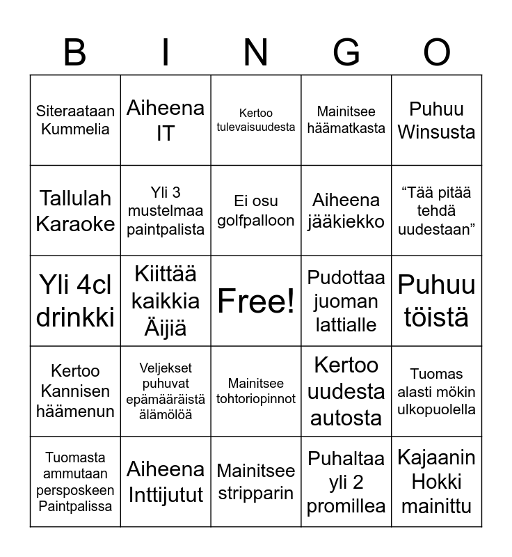 This bingo card has a free space and 24 words: Veljekset puhuvat epämääräistä älämölöä, Aiheena Inttijutut, Ei osu golfpalloon, Tuomasta ammutaan persposkeen Paintpalissa, Puhuu Winsusta, Siteraataan Kummelia, Tallulah Karaoke, Aiheena IT, Pudottaa juoman lattialle, Mainitsee tohtoriopinnot, Aiheena jääkiekko, Yli 4cl drinkki, Kertoo uudesta autosta, Tuomas alasti mökin ulkopuolella, Yli 3 mustelmaa paintpalista, Puhaltaa yli 2 promillea, Puhuu töistä, Kertoo tulevaisuudesta, “Tää pitää tehdä uudestaan”, Kiittää kaikkia Äijiä, Kajaanin Hokki mainittu, Kertoo Kannisen häämenun, Mainitsee häämatkasta and Mainitsee stripparin.