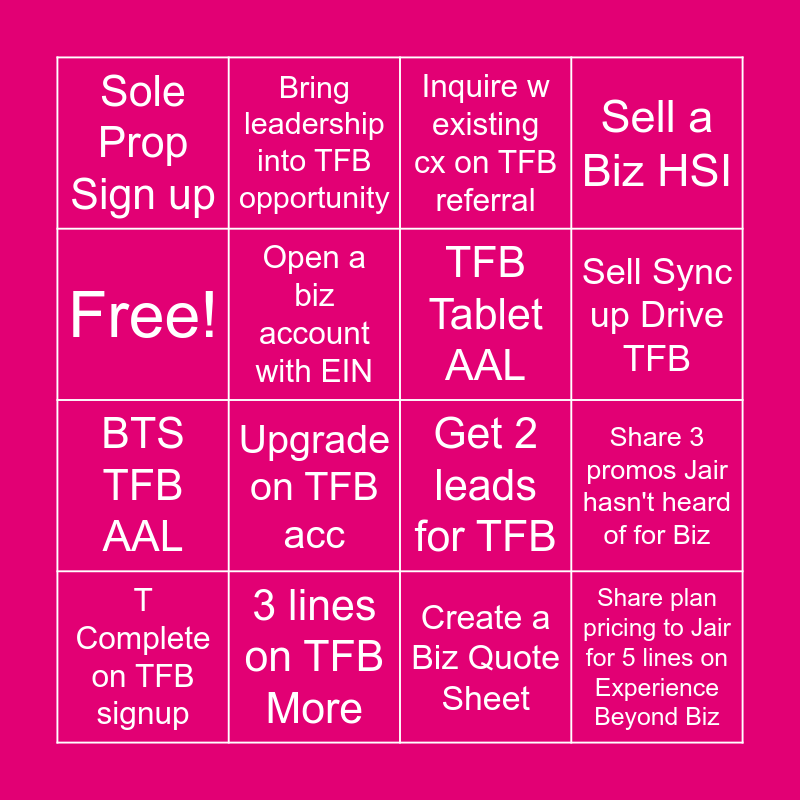This bingo card has 16 words: 3 lines on TFB More, Share 3 promos Jair hasn't heard of for Biz, Inquire w existing cx on TFB referral, Sole Prop Sign up, BTS TFB AAL, Bring leadership into TFB opportunity, Get 2 leads for TFB, Create a Biz Quote Sheet, Free!, Open a biz account with EIN, T Complete on TFB signup, Sell a Biz HSI, Upgrade on TFB acc, Sell Sync up Drive TFB, TFB Tablet AAL and Share plan pricing to Jair for 5 lines on Experience Beyond Biz.
