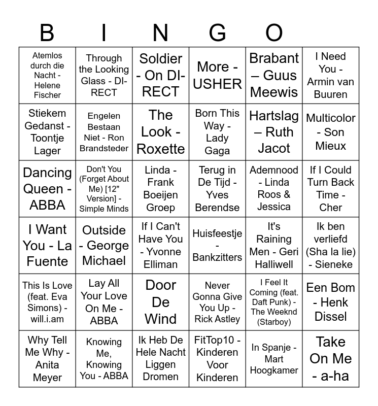 This bingo card has 80 words: Weg Van Jou - Suzan & Freek, Blijven Slapen -Snelle & Maan, Soldier - On DI-RECT, Ladada - Claude, Alles Is Liefde - BLØF, Love Myself - RONDÉ, In Spanje - Mart Hoogkamer, Ik Ga Zwemmen - Mart Hoogkamer, FitTop10 - Kinderen Voor Kinderen, Zing Met Me Mee - Gerard Joling, Door De Wind, Nobody's Wife - Anouk, More - USHER, Atemlos durch die Nacht - Helene Fischer, Whistle - Jax Jones & Calum Scott, I Need You - Armin van Buuren, Een Bom - Henk Dissel, Ademnood - Linda Roos & Jessica, Free!, Linda - Frank Boeijen Groep, Ik Heb De Hele Nacht Liggen Dromen, Brabant – Guus Meewis, Hartslag – Ruth Jacot, Engelen Bestaan Niet - Ron Brandsteder, Stiekem Gedanst - Toontje Lager, Comment Ça Va - The Shorts, Sexy Als Ik Dans - Nielson, Jij Denkt Maar Dat Je Alles Mag Van Mij - Frans Duijts, Leef - André Hazes Jr., Pride (In the Name of Love) - U2, Born This Way - Lady Gaga, Kings & Queens - Ava Max, It's Raining Men - Geri Halliwell, This Is Love (feat. Eva Simons) - will.i.am, If I Can't Have You - Yvonne Elliman, Don't You (Forget About Me) [12" Version] - Simple Minds, Mr. Vain - Culture Beat, The Winner Takes It All - ABBA, Knowing Me, Knowing You - ABBA, Dancing Queen - ABBA, Lay All Your Love On Me - ABBA, Show Me Love - Robin S., Believe - Cher (Believe 25th Anniversary Deluxe Edition), West End Girls - Pet Shop Boys, Why Tell Me Why - Anita Meyer, Through the Looking Glass - DI-RECT, Never Gonna Give You Up - Rick Astley, I Feel It Coming (feat. Daft Punk) - The Weeknd (Starboy), When the Heartache Is Over - Tina Turner, Firework - Katy Perry, Outside - George Michael, Multicolor - Son Mieux, I Want You - La Fuente, Supermodel - RuPaul, No Goodbyes - Linda Wagemakers, Maar Vanavond Heb Ik Hoofdpijn - Hanny, Take On Me - a-ha, Thriller - Michael Jackson, The Reflex - Duran Duran, If I Could Turn Back Time - Cher, The Look - Roxette, Flames (Robin Schulz Remix) - David Guetta & Sia, A Little Bit of Love (Rerecorded) - RuPaul, Ik Ga Door - Ruth Jacott, Hoe - Miss Montreal & Nielson, Kali - Django Wagner, Vrijgezel - Gerard Joling, Just Dance - Lady Gaga, C'est La Vie - Claude, Ga Dan! - Roxy Dekker, Terug in De Tijd - Yves Berendse, Huisfeestje - Bankzitters, Ich bin wie du - Marianne Rosenberg, ROCKSTAR - DaBaby, Amsterdam - FLEMMING, Echte Vrienden - Gerard Joling & Jan Smit, Ik ben verliefd (Sha la lie) - Sieneke, Engelbewaarder - Marco Schuitmaker, Zijn Het Je Ogen - Koos Alberts and Jij Krijgt Die Lach Niet Van Mijn Gezicht - John de Bever.