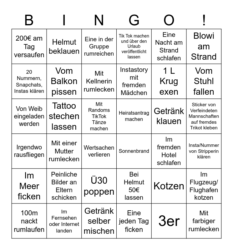 This bingo card has 36 words: Bei Helmut 50€ lassen, Ü30 poppen, Eine jeden Tag ficken, 20 Nummern, Snapchats, Instas klären, Irgendwo rausfliegen, Heiratsantrag machen, Vom Balkon pissen, Getränk selber mischen, Eine Nacht am Strand schlafen, Kotzen, Vom Stuhl fallen, Tik Tok machen und über den Urlaub veröffentlicht lassen, Im Flugzeug/ Flughafen kotzen, Tattoo stechen lassen, Instastory mit fremden Mädchen, 200€ am Tag versaufen, Im Meer ficken, Getränk klauen, Von Weib eingeladen werden, Eine in der Gruppe rumreichen, Mit Randoms TikTok Tänze machen, Mit einer Mutter rumlecken, Sonnenbrand, Wertsachen verlieren, Im fremden Hotel schlafen, Helmut beklauen, 1 L Krug exen, Im Fernsehen oder Internet landen, Mit Kellnerin rumlecken, Blowi am Strand, Mit farbiger rumlecken, 100m nackt rumlaufen, Insta/Nummer von Stripperin klären, Sticker von Verfeindeten Mannschaften auf fremdes Trikot kleben, Peinliche Bilder an Eltern schicken and 3er.