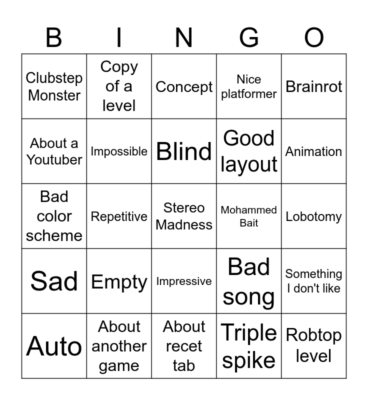 This bingo card has a free space and 24 words: Empty, About another game, Blind, Auto, Brainrot, Clubstep Monster, About a Youtuber, Copy of a level, Mohammed Bait, Impressive, Good layout, Bad color scheme, Bad song, Something I don't like, Impossible, Triple spike, Lobotomy, Concept, Animation, Repetitive, Robtop level, Sad, Nice platformer and About recet tab.