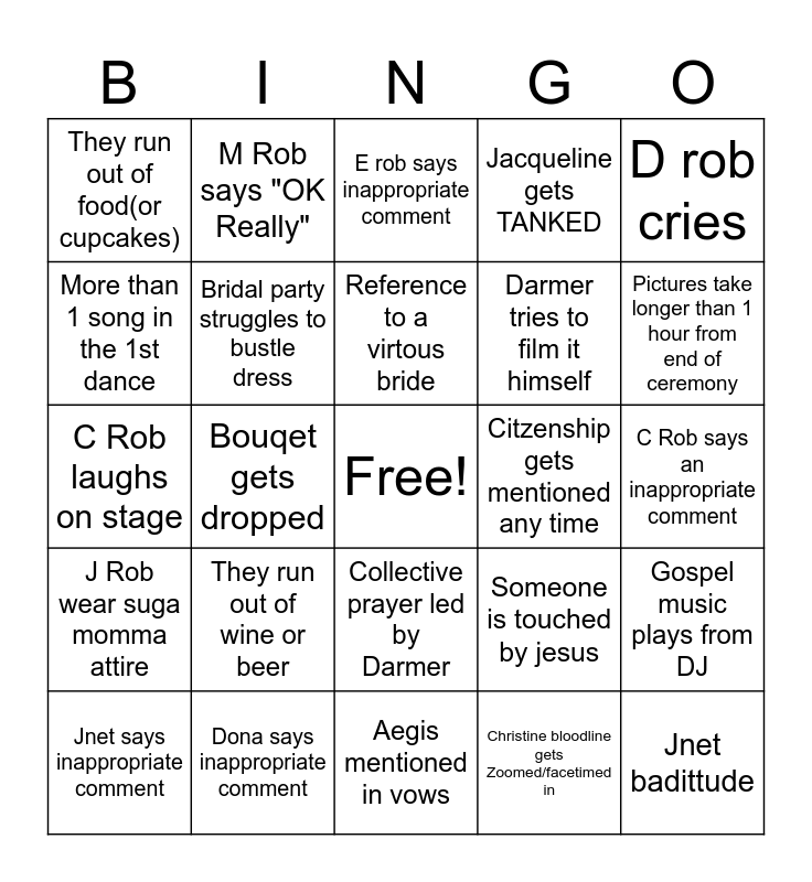 This bingo card has a free space and 35 words: Christine trips on dress, M rob gets triggered at something she cant control, Someone drops a ring, Jacqueline gets TANKED, Gospel music plays from DJ, C Rob laughs on stage, Bridal party struggles to bustle dress, More than half guests gone by 9:30 snack, Darmer tries to film it himself, Bumble gets brought up, J Rob wear suga momma attire, M Rob says "OK Really", Darmer cries, RB turns red, They run out of food(or cupcakes), They run out of wine or beer, Aegis mentioned in vows, Citzenship gets mentioned any time, C Rob says an inappropriate comment, Jnet says inappropriate comment, Dona says inappropriate comment, E rob says inappropriate comment, Christine bloodline gets Zoomed/facetimed in, Jnet badittude, More than 1 song in the 1st dance, Bouqet gets dropped, Collective prayer led by Darmer, Someone trips on heels, Pictures take longer than 1 hour from end of ceremony, Rains during ceremony, RB guilts someone, Reference to a virtous bride, Someone is touched by jesus, D rob cries and Jnet cant hear.