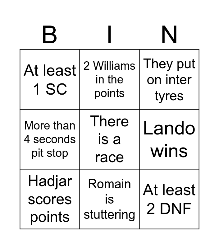 This bingo card has a free space and 8 words: Lando wins, They put on inter tyres, 2 Williams in the points, Hadjar scores points, At least 1 SC, At least 2 DNF, More than 4 seconds pit stop and Romain is stuttering.