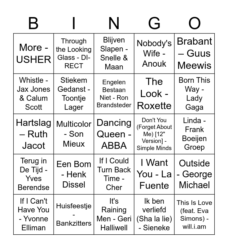 This bingo card has 80 words: Free!, Weg Van Jou - Suzan & Freek, Blijven Slapen -Snelle & Maan, Soldier - On DI-RECT, Ladada - Claude, Alles Is Liefde - BLØF, Love Myself - RONDÉ, In Spanje - Mart Hoogkamer, Ik Ga Zwemmen - Mart Hoogkamer, FitTop10 - Kinderen Voor Kinderen, Zing Met Me Mee - Gerard Joling, Door De Wind - Miss Montreal, Nobody's Wife - Anouk, More - USHER, Atemlos durch die Nacht - Helene Fischer, Whistle - Jax Jones & Calum Scott, I Need You - Armin van Buuren, Een Bom - Henk Dissel, Ademnood - Linda Roos & Jessica, Linda - Frank Boeijen Groep, Ik Heb De Hele Nacht Liggen Dromen, Brabant – Guus Meewis, Hartslag – Ruth Jacot, Engelen Bestaan Niet - Ron Brandsteder, Stiekem Gedanst - Toontje Lager, Comment Ça Va - The Shorts, Sexy Als Ik Dans - Nielson, Jij Denkt Maar Dat Je Alles Mag Van Mij - Frans Duijts, Leef - André Hazes Jr., Pride (In the Name of Love) - U2, Born This Way - Lady Gaga, Kings & Queens - Ava Max, It's Raining Men - Geri Halliwell, This Is Love (feat. Eva Simons) - will.i.am, If I Can't Have You - Yvonne Elliman, Don't You (Forget About Me) [12" Version] - Simple Minds, Mr. Vain - Culture Beat, The Winner Takes It All - ABBA, Knowing Me, Knowing You - ABBA, Dancing Queen - ABBA, Lay All Your Love On Me - ABBA, Show Me Love - Robin S., Believe - Cher (Believe 25th Anniversary Deluxe Edition), West End Girls - Pet Shop Boys, Why Tell Me Why - Anita Meyer, Through the Looking Glass - DI-RECT, Never Gonna Give You Up - Rick Astley, I Feel It Coming (feat. Daft Punk) - The Weeknd (Starboy), When the Heartache Is Over - Tina Turner, Firework - Katy Perry, Outside - George Michael, Multicolor - Son Mieux, I Want You - La Fuente, Supermodel - RuPaul, No Goodbyes - Linda Wagemakers, Maar Vanavond Heb Ik Hoofdpijn - Hanny, Take On Me - a-ha, Thriller - Michael Jackson, The Reflex - Duran Duran, If I Could Turn Back Time - Cher, The Look - Roxette, Flames (Robin Schulz Remix) - David Guetta & Sia, A Little Bit of Love (Rerecorded) - RuPaul, Ik Ga Door - Ruth Jacott, Hoe - Miss Montreal & Nielson, Kali - Django Wagner, Vrijgezel - Gerard Joling, Just Dance - Lady Gaga, C'est La Vie - Claude, Ga Dan! - Roxy Dekker, Terug in De Tijd - Yves Berendse, Huisfeestje - Bankzitters, Ich bin wie du - Marianne Rosenberg, ROCKSTAR - DaBaby, Amsterdam - FLEMMING, Echte Vrienden - Gerard Joling & Jan Smit, Ik ben verliefd (Sha la lie) - Sieneke, Engelbewaarder - Marco Schuitmaker, Zijn Het Je Ogen - Koos Alberts and Jij Krijgt Die Lach Niet Van Mijn Gezicht - John de Bever.