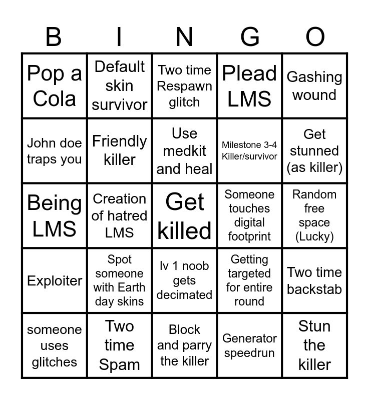 This bingo card has 35 words: shed / chance miss stun, Close to me LMS, 1x1x1x1 snipes someone across map, Friendly killer, lv 1 noob gets decimated, Plead LMS, John doe traps you, Broke killer ankles, Use medkit and heal, Nobody does generators, Being LMS, Gashing wound, hitbox moment (Free), Elliot doesnt heal (dumb elliot), Pop a Cola, Someone touches digital footprint, Generator speedrun, Creation of hatred LMS, Exploiter, Get killed, Getting targeted for entire round, someone uses glitches, Two time backstab, Two time Spam, Two time Respawn glitch, Get stunned (as killer), Stun the killer, Killer with default skin, Milestone 3-4 Killer/survivor, Random free space (Lucky), Cupcakes coolkid skin LMS, Block and parry the killer, Spot someone with Earth day skins, Default skin survivor and Dussekar or Taph Player.