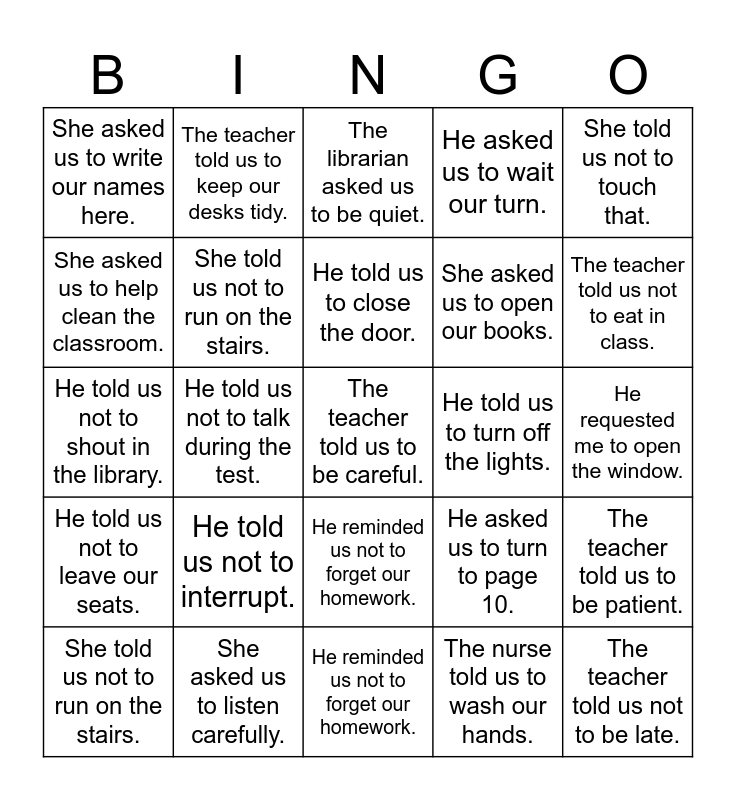 This bingo card has 25 words: He told us not to interrupt., He reminded us not to forget our homework., He told us to close the door., She told us not to run on the stairs., She told us not to touch that., She asked us to write our names here., She asked us to help clean the classroom., The teacher told us to keep our desks tidy., He told us to turn off the lights., He reminded us not to forget our homework., She asked us to open our books., He told us not to shout in the library., He asked us to turn to page 10., The teacher told us to be patient., She told us not to run on the stairs., The teacher told us not to be late., He requested me to open the window., The librarian asked us to be quiet., The teacher told us not to eat in class., He told us not to talk during the test., The teacher told us to be careful., She asked us to listen carefully., He told us not to leave our seats., He asked us to wait our turn. and The nurse told us to wash our hands..