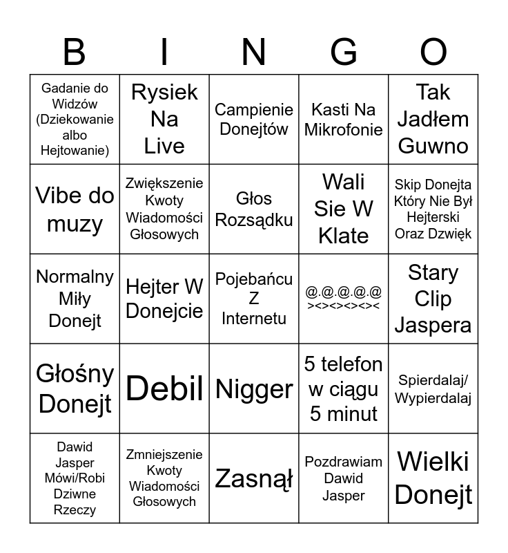 This bingo card has 33 words: Wielki Donejt, Wyłącza Wiadomości Głosowe, Hejter W Donejcie, Insta-Wstanie, Głośny Donejt, Zwiększenie Kwoty Wiadomości Głosowych, Tak Jadłem Guwno, Dawid Jasper Mówi/Robi Dziwne Rzeczy, Rysiek Na Live, Dziwne Dzwieki W Donejcie, Głos Rozsądku, Campienie Donejtów, ALE SIE WKURWIE X 3, gagri gagri, @.@.@.@.@ ><><><><><, Skip Donejta Który Nie Był Hejterski Oraz Dzwięk, Zmniejszenie Kwoty Wiadomości Głosowych, Normalny Miły Donejt, Debil, 5 telefon w ciągu 5 minut, Nigger, Baitowy Donejt, Gadanie do Widzów (Dziekowanie albo Hejtowanie), Stary Clip Jaspera, Zasnął, Pojebańcu Z Internetu, Kasti Na Mikrofonie, Wali Sie W Klate, Vibe do muzy, Spierdalaj/ Wypierdalaj, Scam Na Włączenie Wiadomości Głosowych, Pozdrawiam Dawid Jasper and Pedofil.