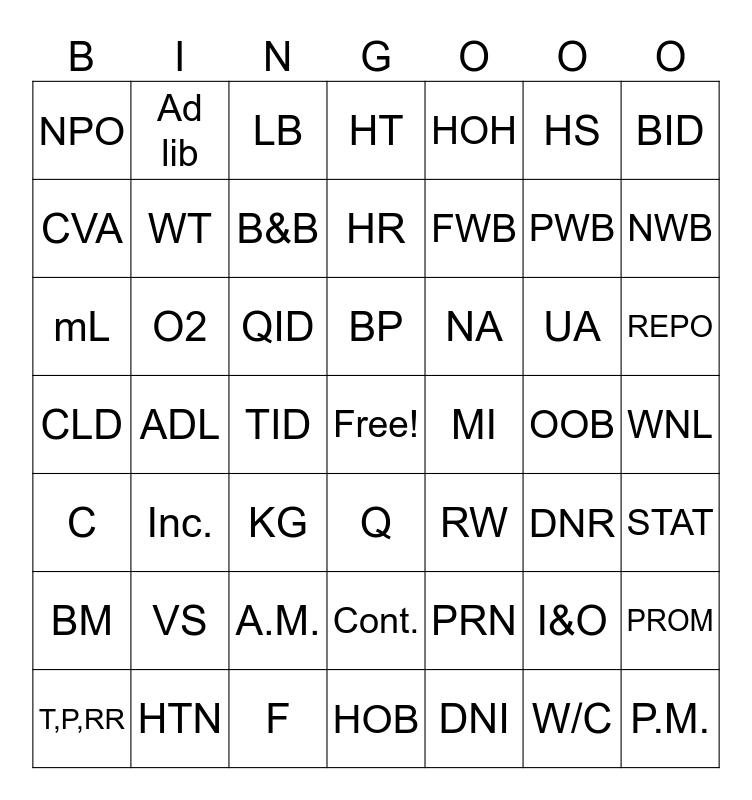 This bingo card has a free space and 48 words: PRN, PWB, HOB, ADL, QID, WNL, Ad lib, HTN, HS, Q, BID, HT, UA, NA, BM, OOB, CVA, NWB, I&O, HOH, FWB, TID, NPO, WT, PROM, B&B, REPO, T,P,RR, BP, O2, W/C, MI, STAT, VS, CLD, RW, DNR, mL, KG, A.M., C, P.M., LB, F, HR, Cont., Inc. and DNI.