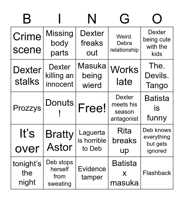 This bingo card has a free space and 39 words: Debra says f 10 times, Rita being Gullible, Doakes sus, Dexter killing an innocent, tonight’s the night, Laguerta is horrible to Deb, Masuka being wierd, Dexter wears his outfit, Dexter being cute with the kids, It’s over, Donuts !, Weird. Debra relationship, Flashback, Batista is funny, Dexter meets his season antagonist, Bratty Astor, Dexter. Almost gets caught, Crime scene, Harry Morgan vision, Rita breaks up, Dexter stalks, Evidence tamper, Works late, The. Devils. Tango, Angel x laguerta, Boat scenes, Working late call, Dark passenger. Mention, Deb and dex pep talk, Missing body parts, Inappropriate quote in front of kids, The ice truck killer scenes, Dexter freaks out, Deb stops herself from sweating, Batista x masuka, masuka is the smartest, Deb knows everything but gets ignored, Prozzys and GOATED Lundy.