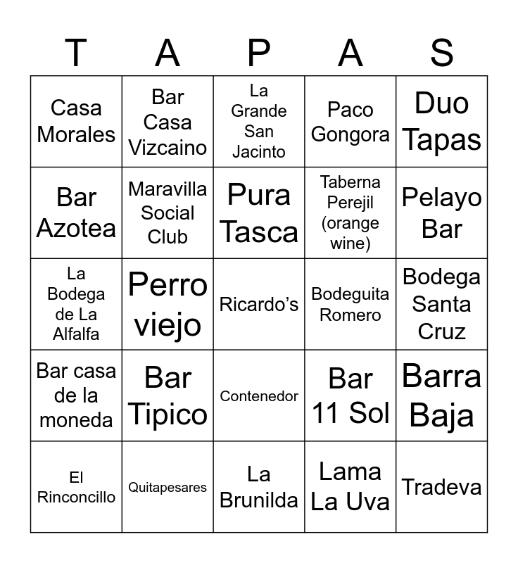 This bingo card has 25 words: Bar Tipico, La Brunilda, Pura Tasca, El Rinconcillo, Duo Tapas, Casa Morales, Bar Azotea, Bar Casa Vizcaino, Bodeguita Romero, Contenedor, Taberna Perejil (orange wine), La Bodega de La Alfalfa, Bar 11 Sol, Barra Baja, Maravilla Social Club, Tradeva, Bodega Santa Cruz, La Grande San Jacinto, Pelayo Bar, Perro viejo, Ricardo’s, Quitapesares, Bar casa de la moneda, Paco Gongora and Lama La Uva.