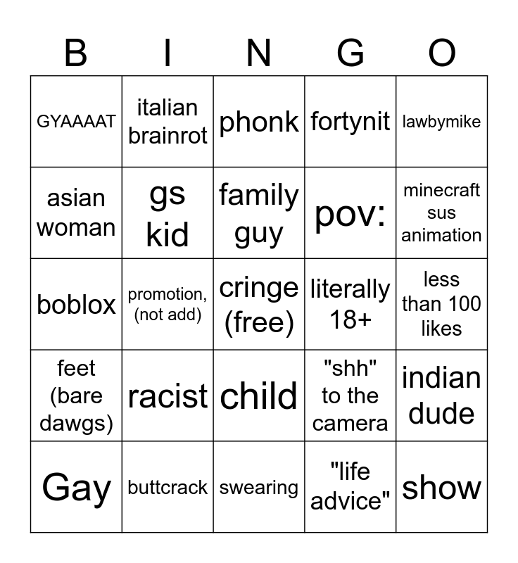 This bingo card has a free space and 24 words: Gay, racist, family guy, "life advice", lawbymike, GYAAAAT, italian brainrot, phonk, literally 18+, less than 100 likes, boblox, gs kid, "shh" to the camera, indian dude, asian woman, buttcrack, swearing, fortynit, minecraft sus animation, feet (bare dawgs), promotion, (not add), child, pov: and show.