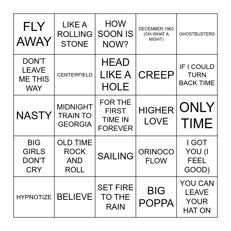 This bingo card has 60 words: BAILANDO, BELIEVE, BEYOND THE SEA, BIG GIRLS DON'T CRY, BIG POPPA, BUST A MOVE, CENTERFIELD, CLOSER, CREEP, DEAD MAN'S PARTY, DECEMBER,1963 (OH WHAT A NIGHT), DEFYING GRAVITY, DON'T LEAVE ME THIS WAY, EASY LOVER, EDGE OF SEVENTEEN, FLY AWAY, FOR THE FIRST TIME IN FOREVER, GHOSTBUSTERS, HAVE YOU EVER SEEN THE RAIN, HEAD LIKE A HOLE, HIGHER LOVE, HOW SOON IS NOW?, HYPNOTIZE, I GOT YOU (I FEEL GOOD), I LIKE IT, I LIKE IT, I LOVE IT, I WANNA BE SEDATED, I'M THE ONLY ONE, IF I COULD TURN BACK TIME, IT'S MY PARTY, KNOCKIN' ON HEAVEN'S DOOR, LA BAMBA, LADY MARMALADE, LET MY LOVE OPEN THE DOOR, LIKE A ROLLING STONE, LIVING IN AMERICA, LONELY IS THE NIGHT, MIDNIGHT TRAIN TO GEORGIA, MYSTERIOUS WAYS, NASTY, NO SCRUBS, OLD TIME ROCK AND ROLL, ONLY TIME, ONLY WANNA BE WITH YOU, ORINOCO FLOW, PART-TIME LOVER, PIANO MAN, PRIDE (IN THE NAME OF LOVE), ROLLING IN THE DEEP, SAILING, SET FIRE TO THE RAIN, SOMETHING LIKE THAT, SOMETHING'S GOTTA GIVE, STAND BACK, SUPERSTITION, THE STROKE, UPTOWN GIRL, WITH A LITTLE HELP FROM MY FRIENDS, YOU CAN LEAVE YOUR HAT ON and YOUNG AT HEART.