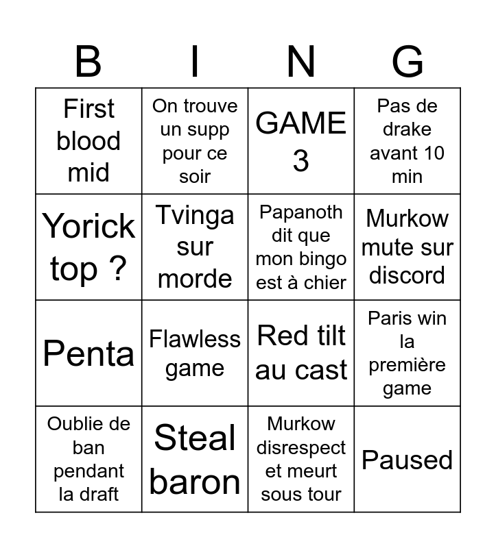 This bingo card has 16 words: Steal baron, Paris win la première game, GAME 3, First blood mid, Penta, On trouve un supp pour ce soir, Red tilt au cast, Murkow disrespect et meurt sous tour, Yorick top ?, Tvinga sur morde, Oublie de ban pendant la draft, Pas de drake avant 10 min, Flawless game, Murkow mute sur discord, Papanoth dit que mon bingo est à chier and Paused.