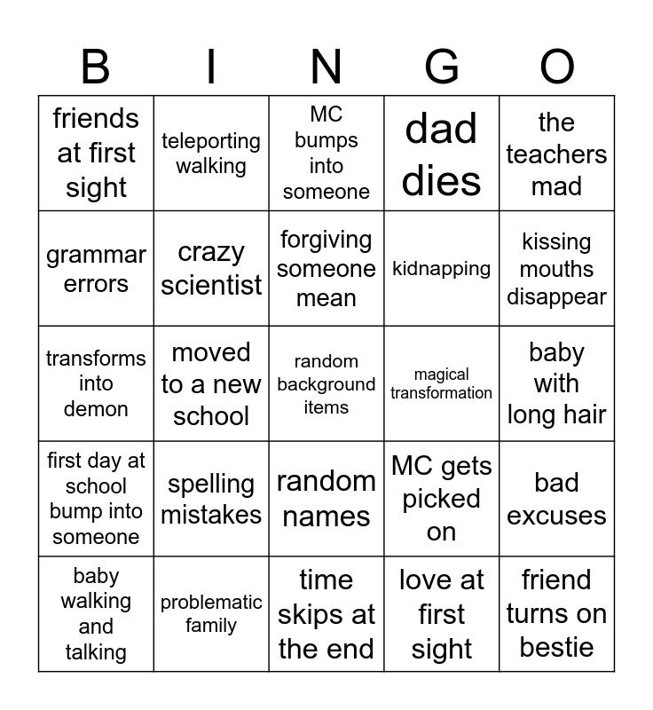 This bingo card has a free space and 24 words: spelling mistakes, problematic family, forgiving someone mean, baby walking and talking, the teachers mad, friends at first sight, grammar errors, teleporting walking, magical transformation, random names, kidnapping, transforms into demon, MC gets picked on, bad excuses, crazy scientist, love at first sight, baby with long hair, MC bumps into someone, kissing mouths disappear, moved to a new school, friend turns on bestie, first day at school bump into someone, dad dies and time skips at the end.