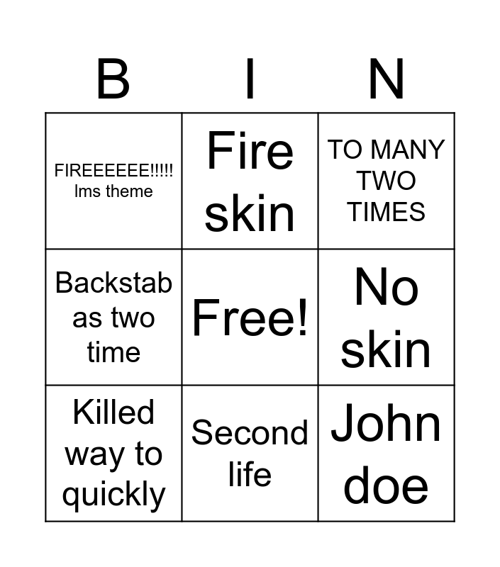 This bingo card has a free space and 8 words: Backstab as two time, Fire skin, No skin, Killed way to quickly, TO MANY TWO TIMES, FIREEEEEE!!!!! lms theme, Second life and John doe.