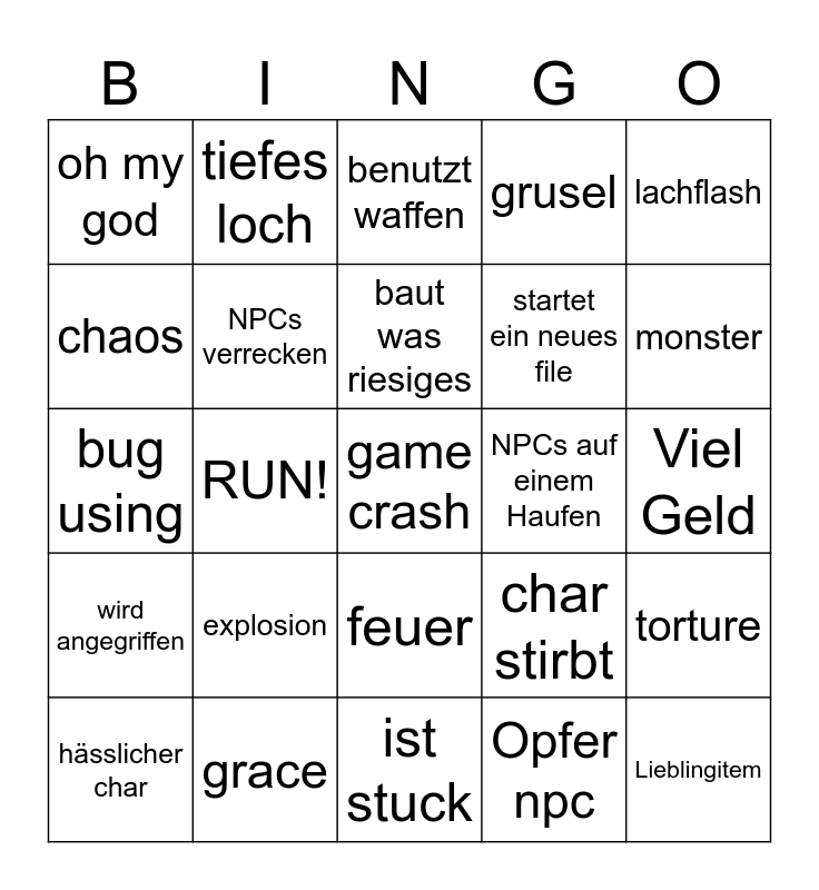 This bingo card has a free space and 24 words: explosion, grace, baut was riesiges, hässlicher char, lachflash, oh my god, chaos, tiefes loch, NPCs auf einem Haufen, feuer, startet ein neues file, bug using, char stirbt, torture, NPCs verrecken, Opfer npc, Viel Geld, benutzt waffen, monster, RUN!, Lieblingitem, wird angegriffen, grusel and ist stuck.