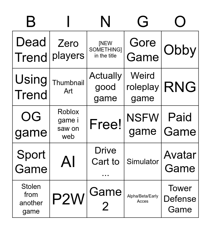This bingo card has a free space and 24 words: AI, P2W, Actually good game, Stolen from another game, Obby, Dead Trend, Using Trend, Zero players, NSFW game, Drive Cart to ..., Weird roleplay game, OG game, Simulator, Avatar Game, Thumbnail Art, Alpha/Beta/Early Acces, Paid Game, [NEW SOMETHING] in the title, RNG, Roblox game i saw on web, Tower Defense Game, Sport Game, Gore Game and Game 2.