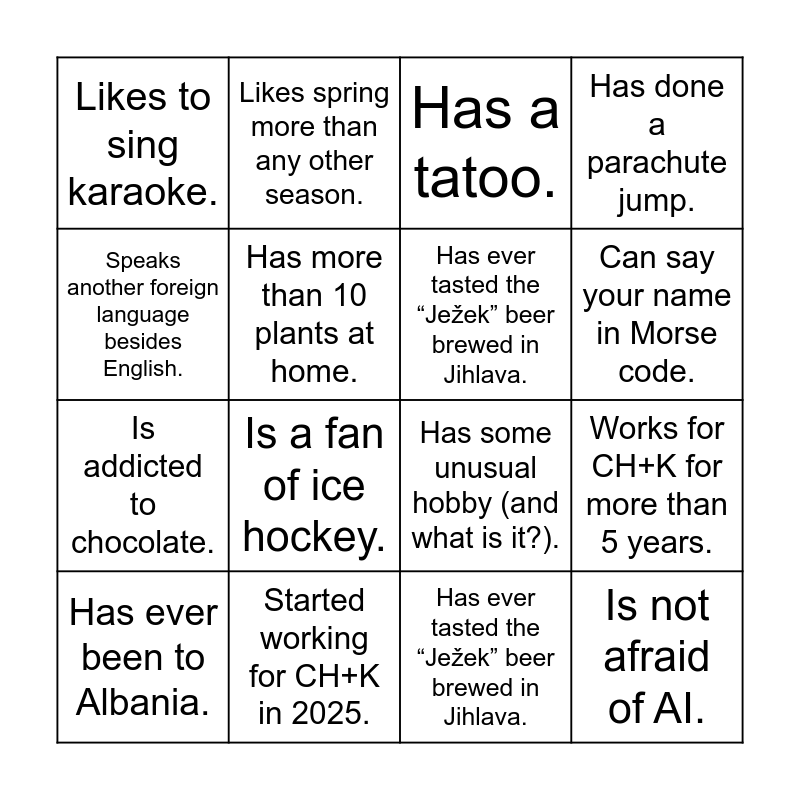 This bingo card has 20 words: Works for CH+K for more than 5 years., Loves to ride a bike., Has a tatoo., Was born in Brno., Has ever been to Albania., Speaks another foreign language besides English., Started working for CH+K in 2025., Likes to sing karaoke., Is addicted to chocolate., Likes spring more than any other season., Is a fan of ice hockey., Has some unusual hobby (and what is it?)., Has more than 10 plants at home., Is not afraid of AI., Has ever tasted the “Ježek” beer brewed in Jihlava., Prefers the mountains to the sea., Can say your name in Morse code., Has done a parachute jump., Has ever tasted the “Ježek” beer brewed in Jihlava. and Is afraid of spiders..