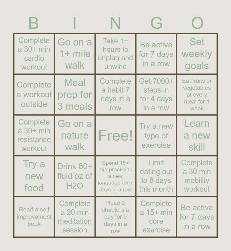 This bingo card has a free space and 24 words: Drink 60+ fluid oz of H2O, Complete a 20 min meditation session, Complete a habit 7 days in a row, Read a self improvement book, Set weekly goals, Complete a 30+ min cardio workout, Complete a workout outside, Go on a 1+ mile walk, Try a new type of exercise, Spend 15+ min practicing a new language for 7 days in a row, Get 7000+ steps in for 4 days in a row, Complete a 30+ min resistance workout, Limit eating out to 8 days this month, Complete a 30 min mobility workout, Meal prep for 3 meals, Complete a 15+ min core exercise, Learn a new skill, Take 1+ hours to unplug and unwind, Eat fruits or vegetables at every meal for 1 week, Go on a nature walk, Be active for 7 days in a row, Try a new food, Be active for 7 days in a row and Read 2 chapters a day for 5 days in a row.