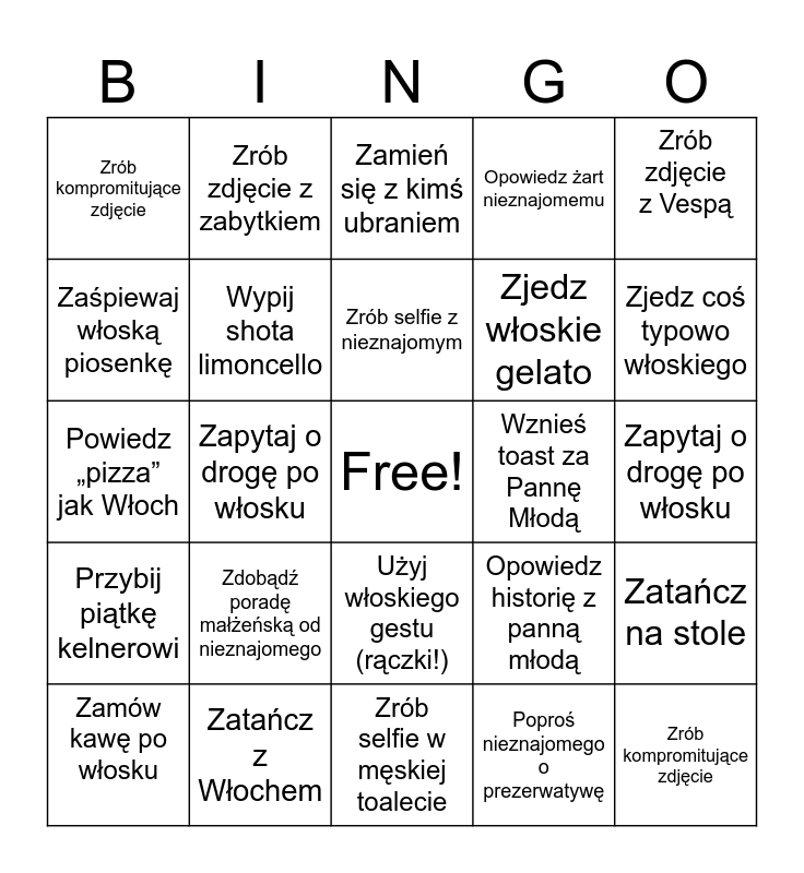 This bingo card has a free space and 24 words: Zdobądź poradę małżeńską od nieznajomego, Zatańcz z Włochem, Zrób selfie z nieznajomym, Zamów kawę po włosku, Zrób zdjęcie z Vespą, Zrób kompromitujące zdjęcie, Zaśpiewaj włoską piosenkę, Zrób zdjęcie z zabytkiem, Wznieś toast za Pannę Młodą, Użyj włoskiego gestu (rączki!), Zjedz włoskie gelato, Powiedz „pizza” jak Włoch, Opowiedz historię z panną młodą, Zatańcz na stole, Wypij shota limoncello, Poproś nieznajomego o prezerwatywę, Zapytaj o drogę po włosku, Zamień się z kimś ubraniem, Zjedz coś typowo włoskiego, Zapytaj o drogę po włosku, Zrób kompromitujące zdjęcie, Przybij piątkę kelnerowi, Opowiedz żart nieznajomemu and Zrób selfie w męskiej toalecie.