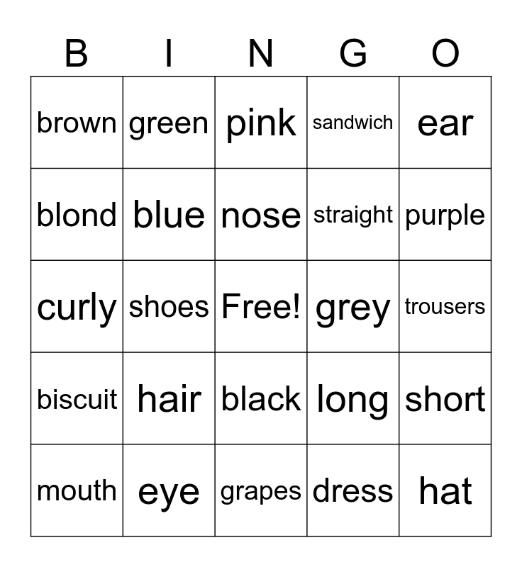This bingo card has a free space and 24 words: hair, eye, nose, mouth, ear, brown, blond, green, grey, black, straight, curly, long, short, blue, dress, trousers, pink, purple, shoes, hat, biscuit, sandwich and grapes.