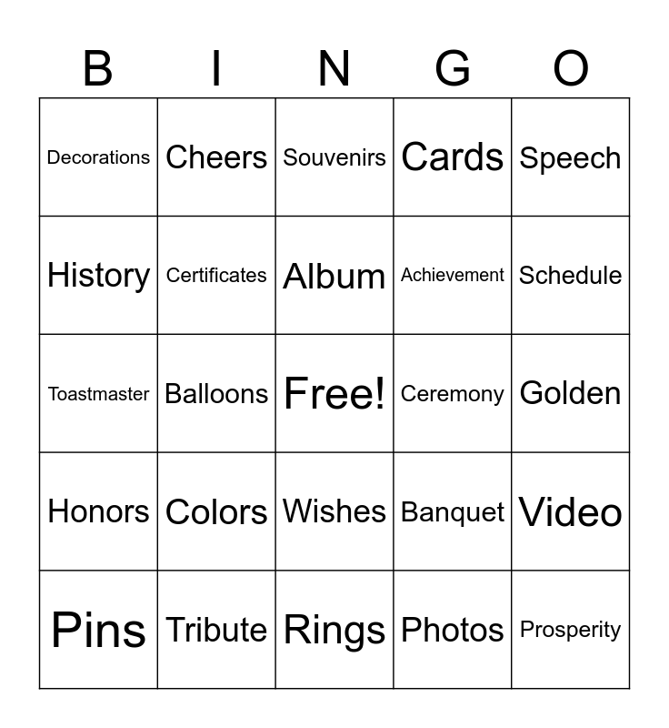 This bingo card has a free space and 100 words: Celebration, Milestone, Golden, Jubilee, Half-century, Commemoration, Festivity, Reunion, Legacy, Tradition, Memories, Toast, Honor, Tribute, Reflection, Gratitude, Achievement, Journey, Love, Commitment, Partnership, Togetherness, Family, Friends, Gathering, Ceremony, Speech, Banquet, Cake, Gifts, Balloons, Decorations, Music, Dance, Photos, Album, Video, Invitation, RSVP, Venue, Dinner, Drinks, Toastmaster, Program, Schedule, Souvenirs, Keepsake, Anniversary, Couple, Rings, Vows, Renewal, Blessings, Happiness, Joy, Laughter, Smiles, Hugs, Kisses, Cards, Flowers, Bouquet, Centerpiece, Candles, Lights, Sparkles, Glitter, Confetti, Banner, Signage, Theme, Colors, Gold, Silver, Bronze, Tradition, Heritage, History, Milestone, Accomplishment, Success, Prosperity, Blessings, Wishes, Toasts, Cheers, Applause, Recognition, Awards, Honors, Plaque, Trophy, Medals, Pins, Certificates, Announcements, Invitations, RSVP, Reception and Party.