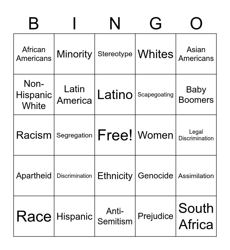 This bingo card has a free space and 24 words: Discrimination, Hispanic, Latino, Race, Asian Americans, African Americans, Non-Hispanic White, Minority, Women, Ethnicity, Scapegoating, Racism, Genocide, Assimilation, Latin America, Prejudice, Legal Discrimination, Stereotype, Baby Boomers, Segregation, South Africa, Apartheid, Whites and Anti-Semitism.