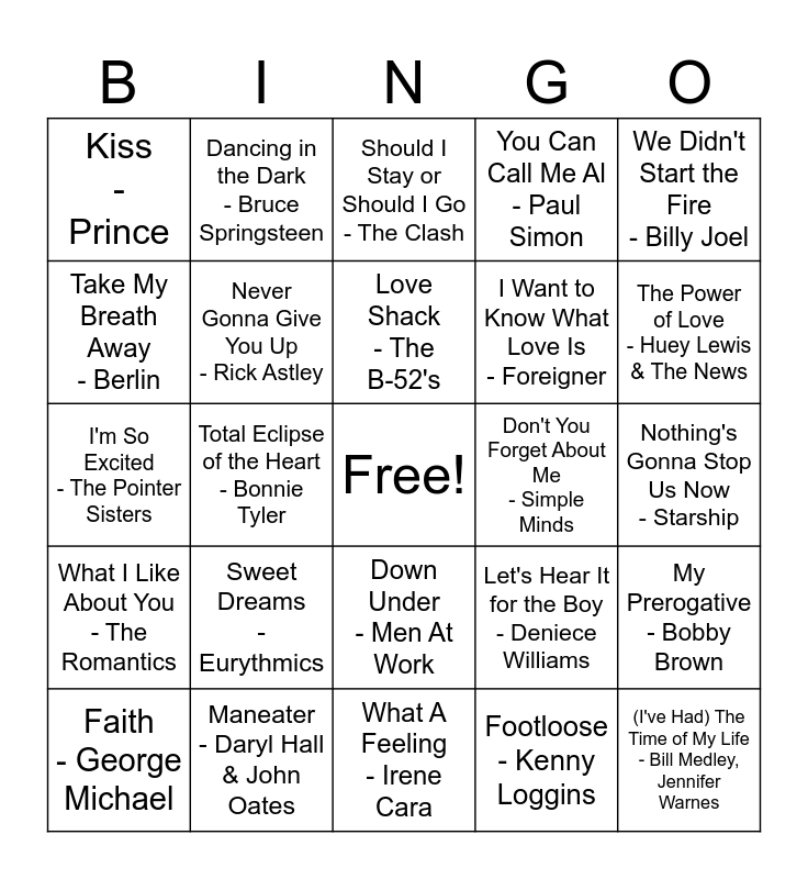 This bingo card has a free space and 24 words: Sweet Dreams - Eurythmics, Maneater - Daryl Hall & John Oates, Love Shack - The B-52's, Faith - George Michael, We Didn't Start the Fire - Billy Joel, Kiss - Prince, Take My Breath Away - Berlin, Dancing in the Dark - Bruce Springsteen, Don't You Forget About Me - Simple Minds, Down Under - Men At Work, I Want to Know What Love Is - Foreigner, I'm So Excited - The Pointer Sisters, Let's Hear It for the Boy - Deniece Williams, My Prerogative - Bobby Brown, Never Gonna Give You Up - Rick Astley, Footloose - Kenny Loggins, Nothing's Gonna Stop Us Now - Starship, Should I Stay or Should I Go - The Clash, The Power of Love - Huey Lewis & The News, Total Eclipse of the Heart - Bonnie Tyler, (I've Had) The Time of My Life - Bill Medley, Jennifer Warnes, What I Like About You - The Romantics, You Can Call Me Al - Paul Simon and What A Feeling - Irene Cara.