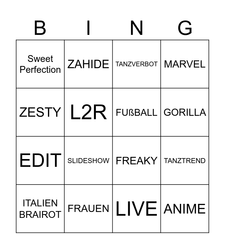 This bingo card has 16 words: FRAUEN, TANZTREND, TANZVERBOT, Sweet Perfection, EDIT, ZAHIDE, FREAKY, LIVE, ZESTY, L2R, ITALIEN BRAIROT, MARVEL, SLIDESHOW, GORILLA, FUßBALL and ANIME.