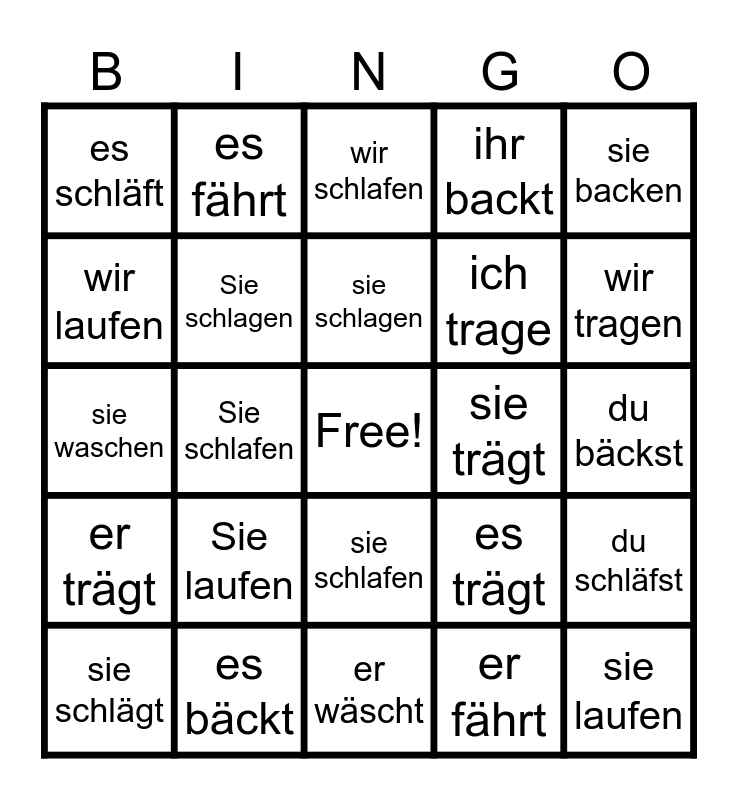 This bingo card has a free space and 69 words: ich backe, du bäckst, er bäckt, sie bäckt, es bäckt, wir backen, ihr backt, sie backen, sie backen, ich schlafe, du schläfst, er schläft, es schläft, wir schlafen, ihr schlaft, Sie schlafen, sie schlafen, ich trage, du trägst, er trägt, sie trägt, es trägt, wir tragen, ihr tragt, Sie tragen, sie tragen, ich fahre, du fährst, er fährt, sie fährt, es fährt, wir fahren, ihr fahrt, Sie fahren, sie fahren, ich laufe, du läufst, er läuft, wir laufen, ihr lauft, Sie laufen, sie laufen, ich schlage, du schlägst, er schlägt, sie schlägt, es schlägt, wir schlagen, ihr schlagt, Sie schlagen, sie schlagen, ich wasche, du wäschst, er wäscht, sie wäscht, es wäscht, wir waschen, ihr waschen, Sie waschen, sie waschen, ich lade...ein, du lädst...ein, er lädt...ein, sie lädt...ein, es lädt...ein, wir laden...ein, ihr ladet...ein, Sie laden...ein and sie laden...ein.
