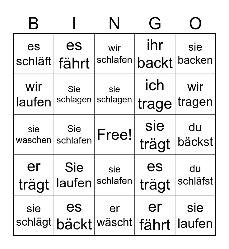 This bingo card has a free space and 69 words: ich backe, du bäckst, er bäckt, sie bäckt, es bäckt, wir backen, ihr backt, Sie backen, sie backen, ich schlafe, du schläfst, er schläft, es schläft, wir schlafen, ihr schlaft, Sie schlafen, sie schlafen, ich trage, du trägst, er trägt, sie trägt, es trägt, wir tragen, ihr tragt, Sie tragen, sie tragen, ich fahre, du fährst, er fährt, sie fährt, es fährt, wir fahren, ihr fahrt, Sie fahren, sie fahren, ich laufe, du läufst, er läuft, wir laufen, ihr lauft, Sie laufen, sie laufen, ich schlage, du schlägst, er schlägt, sie schlägt, es schlägt, wir schlagen, ihr schlagt, Sie schlagen, sie schlagen, ich wasche, du wäschst, er wäscht, sie wäscht, es wäscht, wir waschen, ihr waschen, Sie waschen, sie waschen, ich lade...ein, du lädst...ein, er lädt...ein, sie lädt...ein, es lädt...ein, wir laden...ein, ihr ladet...ein, Sie laden...ein and sie laden...ein.