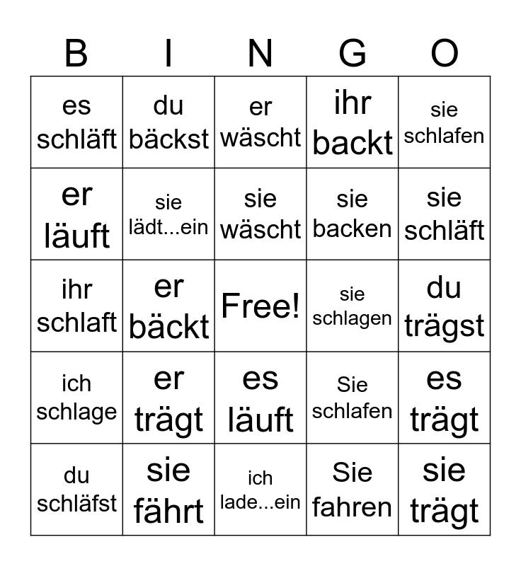 This bingo card has a free space and 72 words: ich backe, du bäckst, er bäckt, sie bäckt, es bäckt, wir backen, ihr backt, Sie backen, sie backen, ich schlafe, du schläfst, er schläft, sie schläft, es schläft, wir schlafen, ihr schlaft, Sie schlafen, sie schlafen, ich trage, du trägst, er trägt, sie trägt, es trägt, wir tragen, ihr tragt, Sie tragen, sie tragen, ich fahre, du fährst, er fährt, sie fährt, es fährt, wir fahren, ihr fahrt, Sie fahren, sie fahren, ich laufe, du läufst, er läuft, sie läuft, es läuft, wir laufen, ihr lauft, Sie laufen, sie laufen, ich schlage, du schlägst, er schlägt, sie schlägt, es schlägt, wir schlagen, ihr schlagt, Sie schlagen, sie schlagen, ich wasche, du wäschst, er wäscht, sie wäscht, es wäscht, wir waschen, ihr waschen, Sie waschen, sie waschen, ich lade...ein, du lädst...ein, er lädt...ein, sie lädt...ein, es lädt...ein, wir laden...ein, ihr ladet...ein, Sie laden...ein and sie laden...ein.