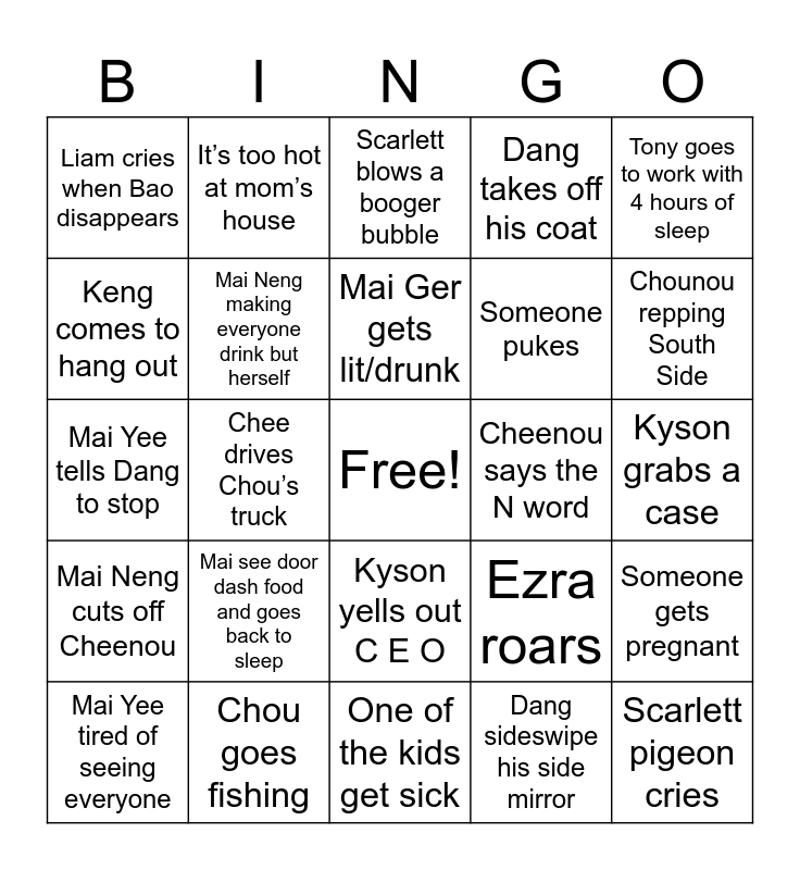This bingo card has a free space and 24 words: Mai see door dash food and goes back to sleep, Chou goes fishing, Mai Ger gets lit/drunk, Mai Yee tired of seeing everyone, Tony goes to work with 4 hours of sleep, Liam cries when Bao disappears, Keng comes to hang out, It’s too hot at mom’s house, Cheenou says the N word, Kyson yells out C E O, Someone pukes, Mai Yee tells Dang to stop, Ezra roars, Someone gets pregnant, Mai Neng making everyone drink but herself, Dang sideswipe his side mirror, Kyson grabs a case, Scarlett blows a booger bubble, Chounou repping South Side, Chee drives Chou’s truck, Scarlett pigeon cries, Mai Neng cuts off Cheenou, Dang takes off his coat and One of the kids get sick.