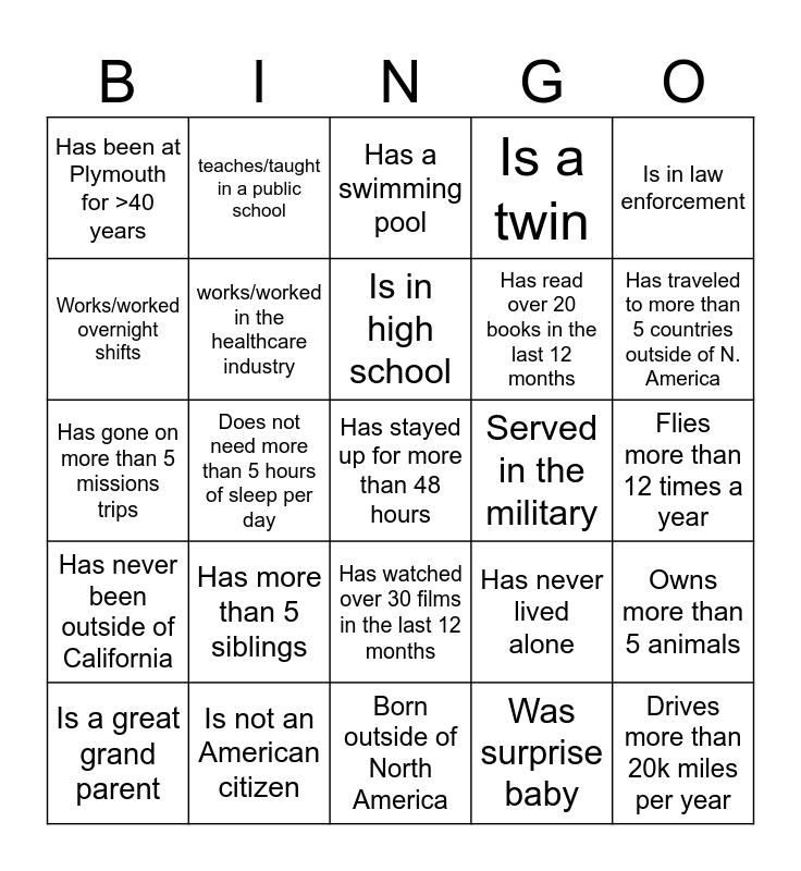 This bingo card has 25 words: Has more than 5 siblings, Born outside of North America, Is in high school, Is a great grand parent, Is in law enforcement, Has been at Plymouth for >40 years, Works/worked overnight shifts, teaches/taught in a public school, Served in the military, Has watched over 30 films in the last 12 months, Has read over 20 books in the last 12 months, Has gone on more than 5 missions trips, Has never lived alone, Owns more than 5 animals, works/worked in the healthcare industry, Drives more than 20k miles per year, Flies more than 12 times a year, Has a swimming pool, Has traveled to more than 5 countries outside of N. America, Does not need more than 5 hours of sleep per day, Has stayed up for more than 48 hours, Is not an American citizen, Has never been outside of California, Is a twin and Was surprise baby.