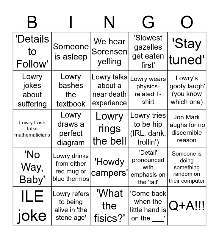 This bingo card has a free space and 24 words: Lowry drinks from either red mug or blue thermos, Lowry refers to being alive in 'the stone age', Lowry talks about a near death experience, ILE joke, 'Stay tuned', 'Details to Follow', Lowry jokes about suffering, Someone is asleep, Lowry tries to be hip (IRL, dank, trollin'), 'Howdy campers', Lowry wears physics-related T-shirt, Lowry trash talks mathematicians, 'Detail' pronounced with emphasis on the 'tail', Someone is doing something random on their computer, Lowry bashes the textbook, 'Come back when the little hand is on the ___', Jon Mark laughs for no discernible reason, We hear Sorensen yelling, Lowry's 'goofy laugh' (you know which one), Lowry draws a perfect diagram, Q+A!!!, 'No Way, Baby', 'Slowest gazelles get eaten first' and 'What the fisics?'.